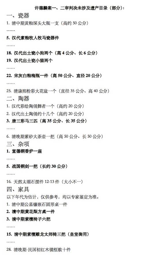 本案一审、二审来回波折,原、被告双方针对的遗产系价值21亿的72幅字画和3个紫砂壶。殊不知,许老珍藏的宝物可远远不止这些,许老还收藏有古董瓷器、陶器、木雕、香炉等等,清代家具就有差不多30件,保守估计,许老遗产继承案未涉及的财产价值堪比72幅字画和3个紫砂壶,遗产总额或直接翻倍!